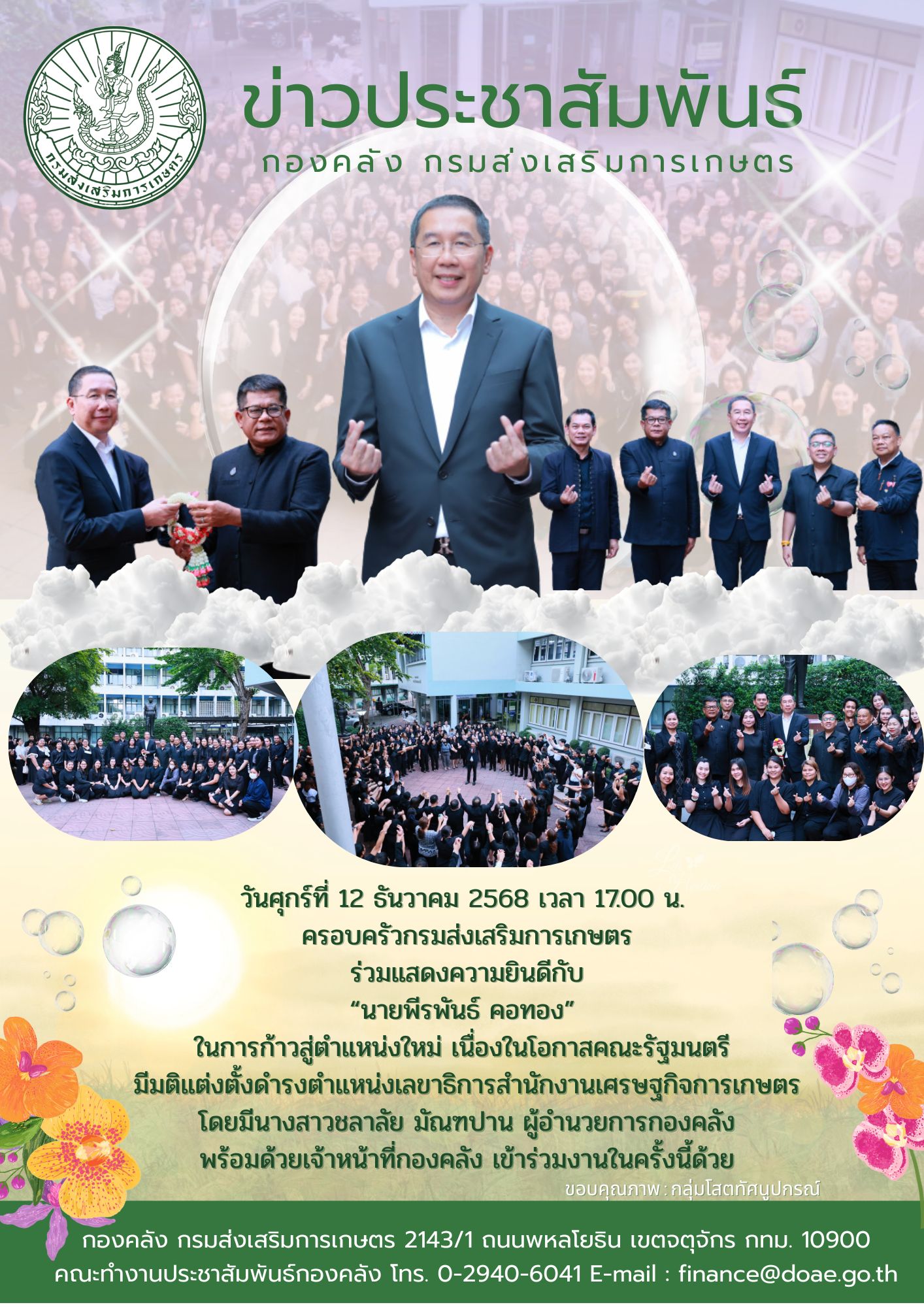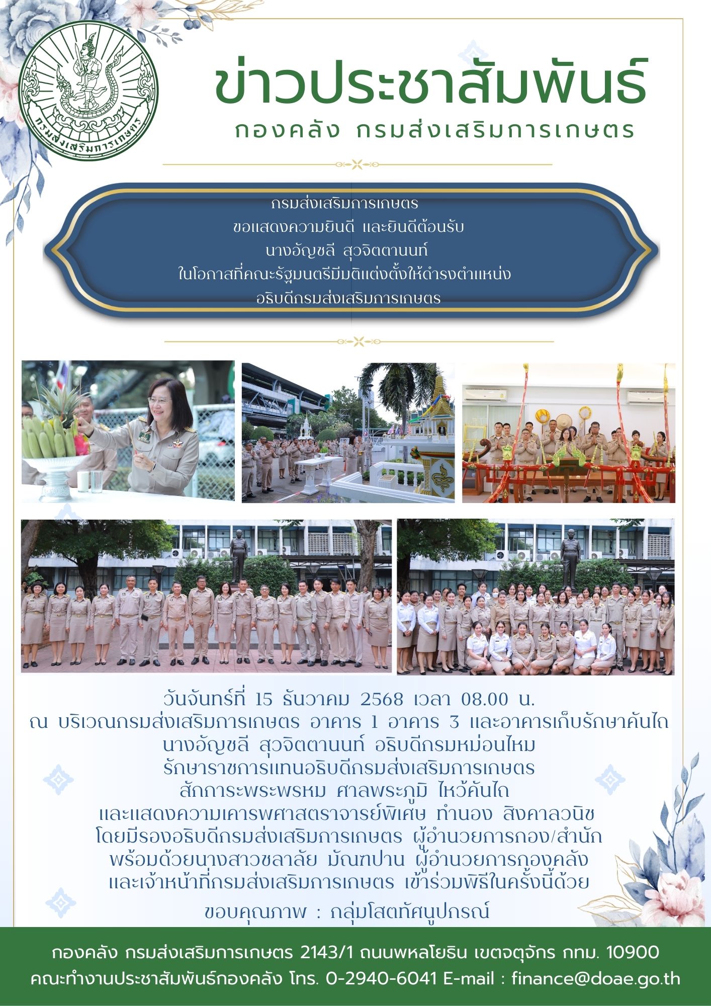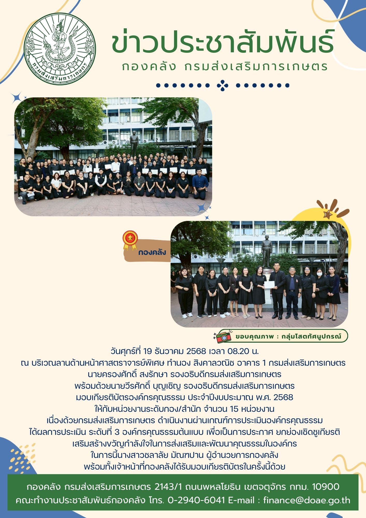กองคลังแจ้งเงินจัดสรรงบประมาณรายจ่ายประจำปีงบประมาณ พ.ศ. 2569 ในระบบ New GFMIS Thai ครั้งที่ 200 ให้จังหวัดระยอง เพื่อเป็นค่าตอบแทนพนักงานราชการ (เพิ่มเติม) รายละเอียดตามหนังสือกรมส่งเสริมการเกษตร ที่ กษ 1004/13464 ลงวันที่ 30 ธันวาคม 25686 มกราคม 2026