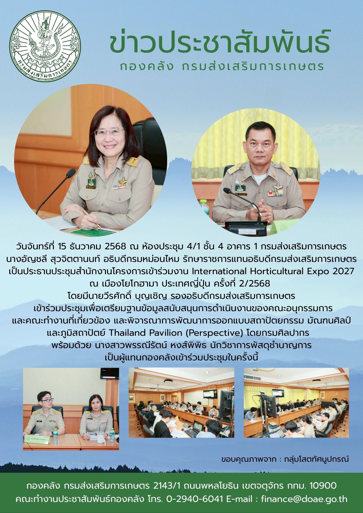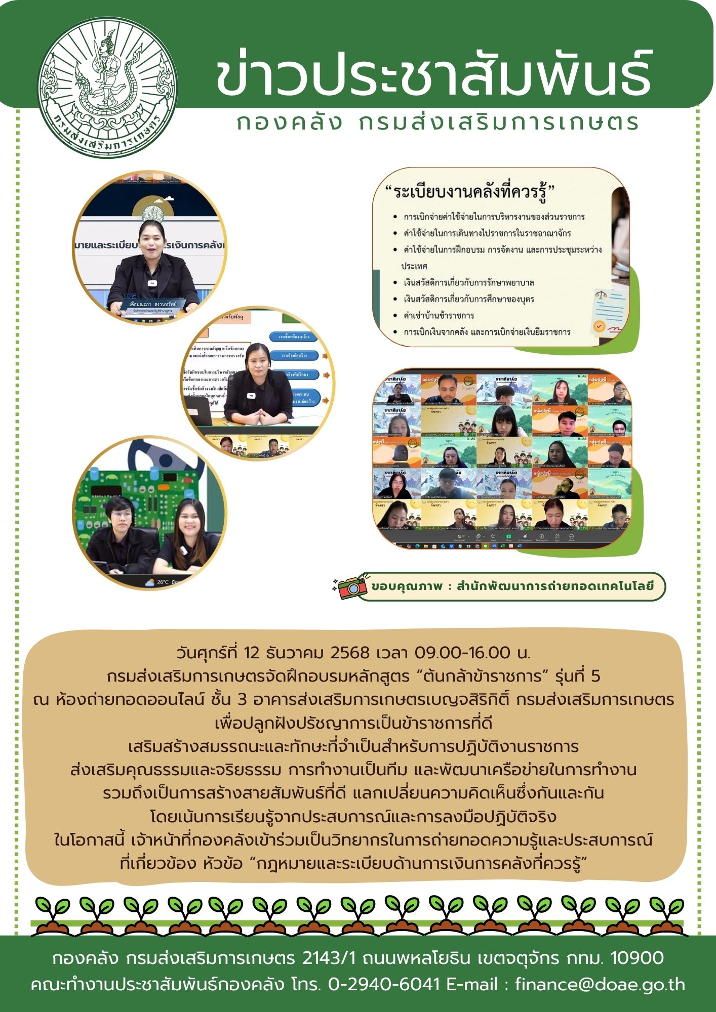 กองคลังแจ้งเงินจัดสรรงบประมาณรายจ่ายประจำปีงบประมาณ พ.ศ. 2569 ในระบบ New GFMIS Thai ครั้งที่ 199 ให้ศูนย์ขยายพันธุ์พืชที่ 2 จังหวัดตรัง เพื่อเป็นค่าใช้จ่ายในการขอรับใบอนุญาตทำประโยชน์ในเขตป่า รายละเอียดตามหนังสือ ที่ กษ 1004/13480 ลงวันที่ 30 ธันวาคม 25686 มกราคม 2026