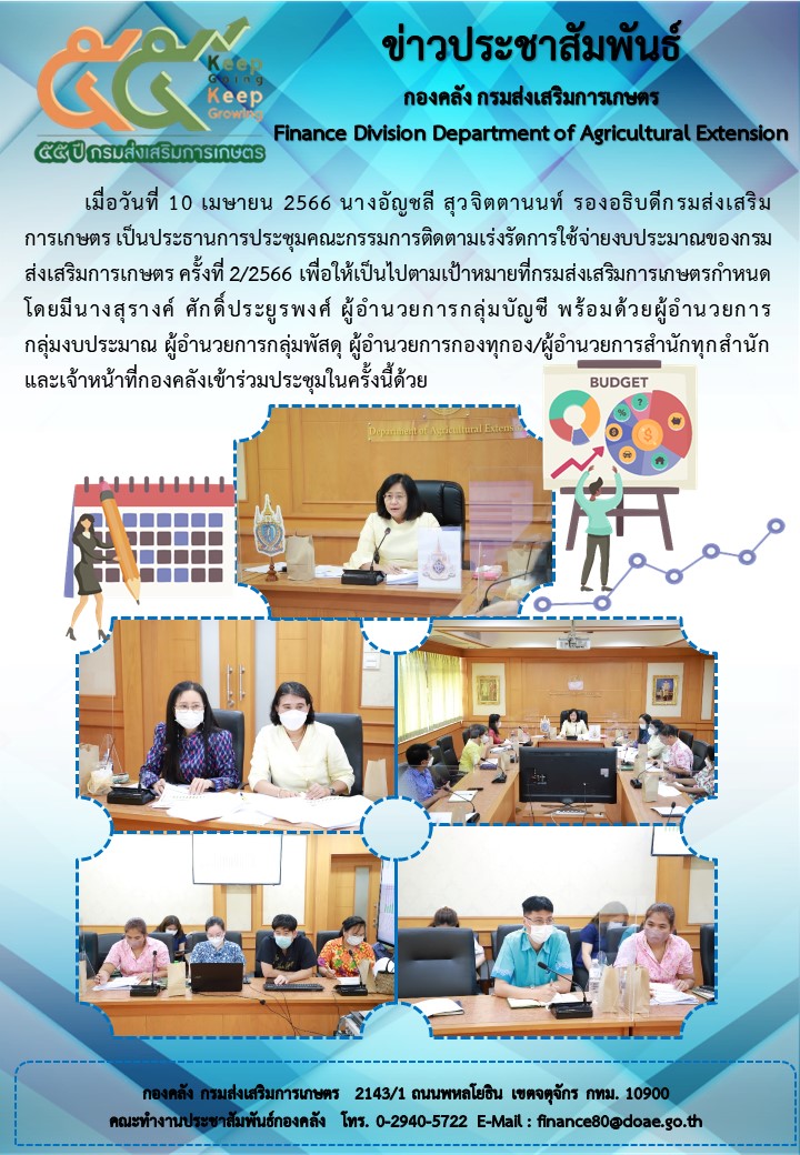 เมื่อวันที่ 10 เมษายน 2566 นางอัญชลี สุวจิตตานนท์ รองอธิบดีกรมส่งเสริมการเกษตร เป็นประธานการประชุมคณะกรรมการติดตามเร่งรัดการใช้จ่ายงบประมาณของกรมส่งเสริมการเกษตร ครั้งที่ 2/2566 เพื่อให้เป็นไปตามเป้าหมายที่กรมส่งเสริมการเกษตรกำหนด โดยมีนางสุรางค์ ศักดิ์ประยูรพงศ์ ผู้อำนวยการกลุ่มบัญชี พร้อมด้วยผู้อำนวยการ กลุ่มงบประมาณ ผู้อำนวยการกลุ่มพัสดุ ผู้อำนวยการกองทุกอง/ผู้อำนวยการสำนักทุกสำนัก และเจ้าหน้าที่กองคลังเข้าร่วมประชุมในครั้งนี้ด้วย