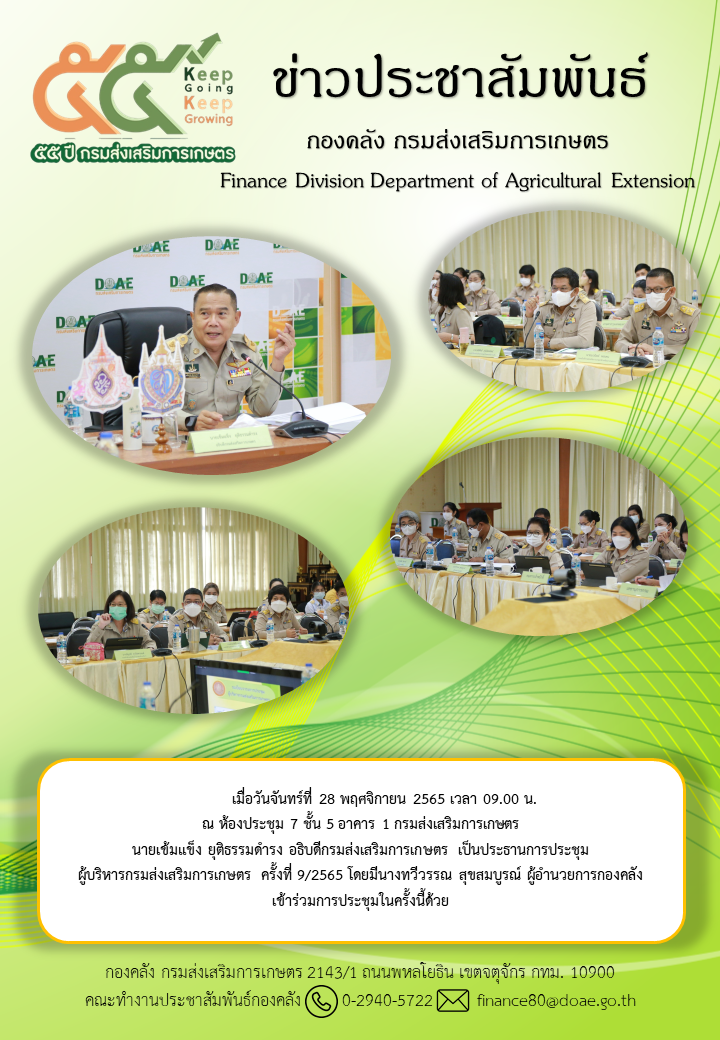 เมื่อวันจันทร์ที่ 28 พฤศจิกายน 2565 เวลา 09.00 น. ณ ห้องประชุม 7 ชั้น 5 อาคาร 1 กรมส่งเสริมการเกษตร นายเข้มแข็ง ยุติธรรมดำรง อธิบดีกรมส่งเสริมการเกษตร เป็นประธานการประชุมผู้บริหารกรมส่งเสริมการเกษตร ครั้งที่ 9/2565 โดยมีนางทวีวรรณ สุขสมบูรณ์ ผู้อำนวยการกองคลัง เข้าร่วมการประชุมในครั้งนี้ด้วย SBOTOP | เดิมพันบอลเดี่ยว จ่ายเต็มไม่มีหัก