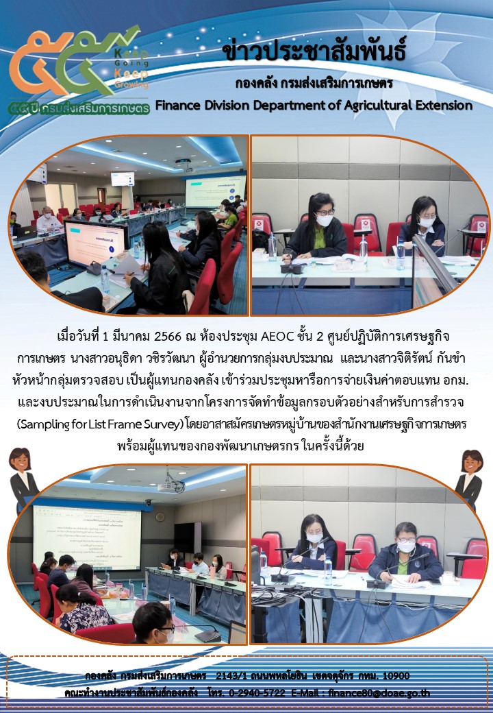 เมื่อวันที่ 1 มีนาคม 2566 ณ ห้องประชุม AEOC ชั้น 2 ศูนย์ปฏิบัติการเศรษฐกิจการเกษตร นางสาวอนุธิดา วชิรวัฒนา ผู้อำนวยการกลุ่มงบประมาณ และนางสาวจิติรัตน์ กันขำ หัวหน้ากลุ่มตรวจสอบ เป็นผู้แทนกองคลัง เข้าร่วมประชุมหารือการจ่ายเงินค่าตอบแทน อกม. และงบประมาณในการดำเนินงานจากโครงการจัดทำข้อมูลกรอบตัวอย่างสำหรับการสำรวจ (Sampling for List Frame Survey) โดยอาสาสมัครเกษตรหมู่บ้านของสำนักงานเศรษฐกิจการเกษตร พร้อมผู้แทนของกองพัฒนาเกษตรกร ในครั้งนี้ด้วย