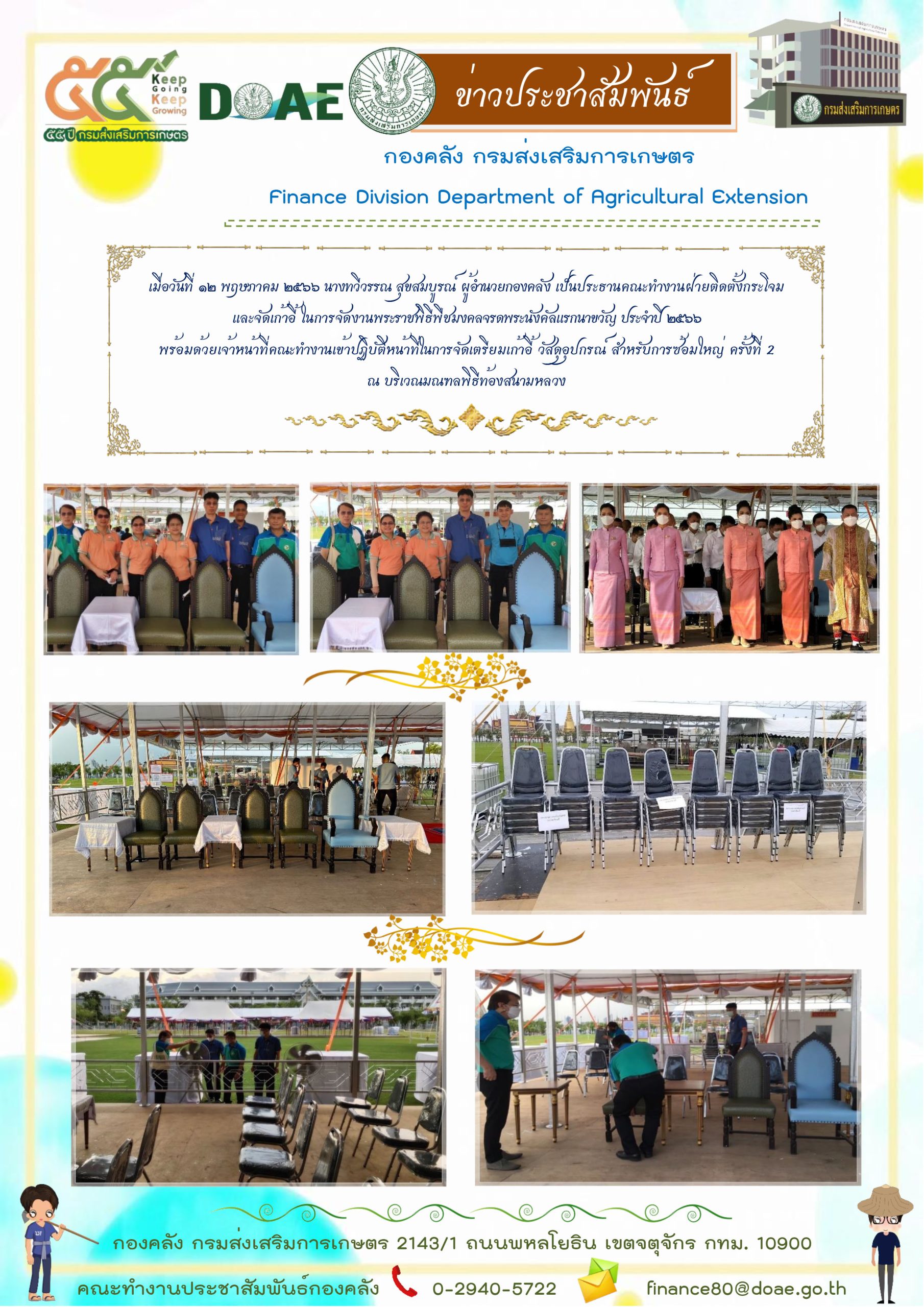เมื่อวันที่ 12 พฤษภาคม 2566 นางทวีวรรณ สุขสมบูรณ์ ผู้อำนวยการกองคลัง เป็นประธานคณะทำงานฝ่ายติดตั้งกระโจมและจัดเก้าอี้ในการจัดงานพระราชพิธีพืชมงคลงจรดพระนังคัลแรกนาขวัญ ประจำปี 2566 พร้อมด้วยเจ้าหน้าที่คณะทำงานเข้าปฏิบัติหน้าที่ในการจัดเตรียมเก้าอี้ วัสดุอุปกรณ์ สำหรับการซ้อมใหญ่ ครั้งที่ 2 ณ บริเวณมณฑลพิธีท้องสนามหลวง