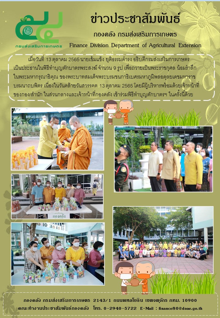 เมื่อวันที่ 13 ตุลาคม 2565 นายเข้มแข็ง ยุติธรรมดำรง อธิบดีกรมส่งเสริมการเกษตร เป็นประธานในพิธีทำบุญตักบาตรพระสงฆ์ จำนวน 9 รูป เพื่อถวายเป็นพระราชกุศล น้อมรำลึกในพระมหากรุณาธิคุณ ของพระบาทสมเด็จพระบรมชนกาธิเบศรมหาภูมิพลอดุลยเดชมหาราช บรมนาถบพิตร เนื่องในวันคล้ายวันสวรรคต 13 ตุลาคม 2565 โดยมีผู้บริหารพร้อมด้วยเจ้าหน้าที่ของกอง/สำนัก ในส่วนกลางและเจ้าหน้าที่กองคลัง เข้าร่วมพิธีทำบุญตักบาตรฯ ในครั้งนี้ด้วย SBOTOP | แทงบอลสเต็ป แตกง่าย จ่ายจริง
