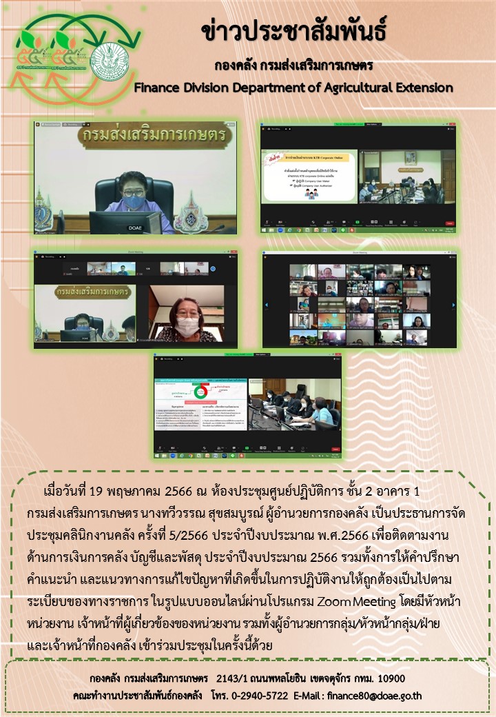 เมื่อวันที่ 19 พฤษภาคม 2566 ณ ห้องประชุมศูนย์ปฏิบัติการ ชั้น 2 อาคาร 1 กรมส่งเสริมการเกษตร นางทวีวรรณ สุขสมบูรณ์ ผู้อำนวยการกองคลัง เป็นประธานการจัดประชุมคลินิกงานคลัง ครั้งที่ 5/2566 ประจำปีงบประมาณ พ.ศ.2566 เพื่อติดตามงานด้านการเงินการคลัง บัญชีและพัสดุ ประจำปีงบประมาณ 2566 รวมทั้งการให้คำปรึกษา คำแนะนำ และแนวทางการแก้ไขปัญหาที่เกิดขึ้นในการปฏิบัติงานให้ถูกต้องเป็นไปตามระเบียบของทางราชการ ในรูปแบบออนไลน์ผ่านโปรแกรม Zoom Meeting โดยมีหัวหน้าหน่วยงาน เจ้าหน้าที่ผู้เกี่ยวข้องของหน่วยงาน รวมทั้งผู้อำนวยการกลุ่ม/หัวหน้ากลุ่ม/ฝ่าย และเจ้าหน้าที่กองคลัง เข้าร่วมประชุมในครั้งนี้ด้วย