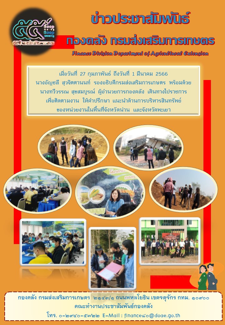 เมื่อวันที่ 27 กุมภาพันธ์ ถึงวันที่ 1 มีนาคม 2566 นางอัญชลี สุวจิตตานนท์ รองอธิบดีกรมส่งเสริมการเกษตร พร้อมด้วย นางทวีวรรณ สุขสมบูรณ์ ผู้อำนวยการกองคลัง เดินทางไปราชการเพื่อติดตามงาน ให้คำปรึกษา แนะนำด้านการบริหารสินทรัพย์ ของหน่วยงานในพื้นที่จังหวัดน่าน และจังหวัดพะเยา