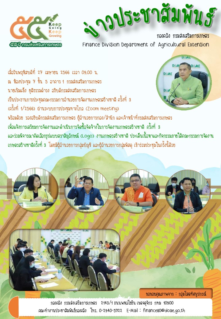 เมื่อวันพฤหัสบดีที่ 27 เมษายน 2566 เวลา 09.00 น. ณ ห้องประชุม 7 ชั้น 5 อาคาร 1 กรมส่งเสริมการเกษตร นายเข้มแข็ง ยุติธรรมดำรง อธิบดีกรมส่งเสริมการเกษตร เป็นประธานการประชุมคณะกรรมการอำนวยการจัดงานเกษตรสร้างชาติ ครั้งที่ 3 (ครั้งที่ 1/2566) ผ่านระบบการประชุมทางไกล (Zoom meeting) พร้อมด้วย รองอธิบดีกรมส่งเสริมการเกษตร ผู้อำนวยการกอง/สำนัก และเจ้าหน้าที่กรมส่งเสริมการเกษตร เพื่อแจ้งการเตรียมการจัดงานและดำเนินการจัดซื้อจัดจ้างในการจัดงานเกษตรสร้างชาติ ครั้งที่ 3 และร่วมพิจารณาคัดเลือกรูปแบบตราสัญลักษณ์ (Logo) งานเกษตรสร้างชาติ ประเด็นเนื้อหาและกิจกรรมภายใต้คณะกรรมการจัดงาน เกษตรสร้างชาติครั้งที่ 3 โดยมีผู้อำนวยการกลุ่มบัญชี และผู้อำนวยการกลุ่มพัสดุ เข้าร่วมประชุมในครั้งนี้ด้วย