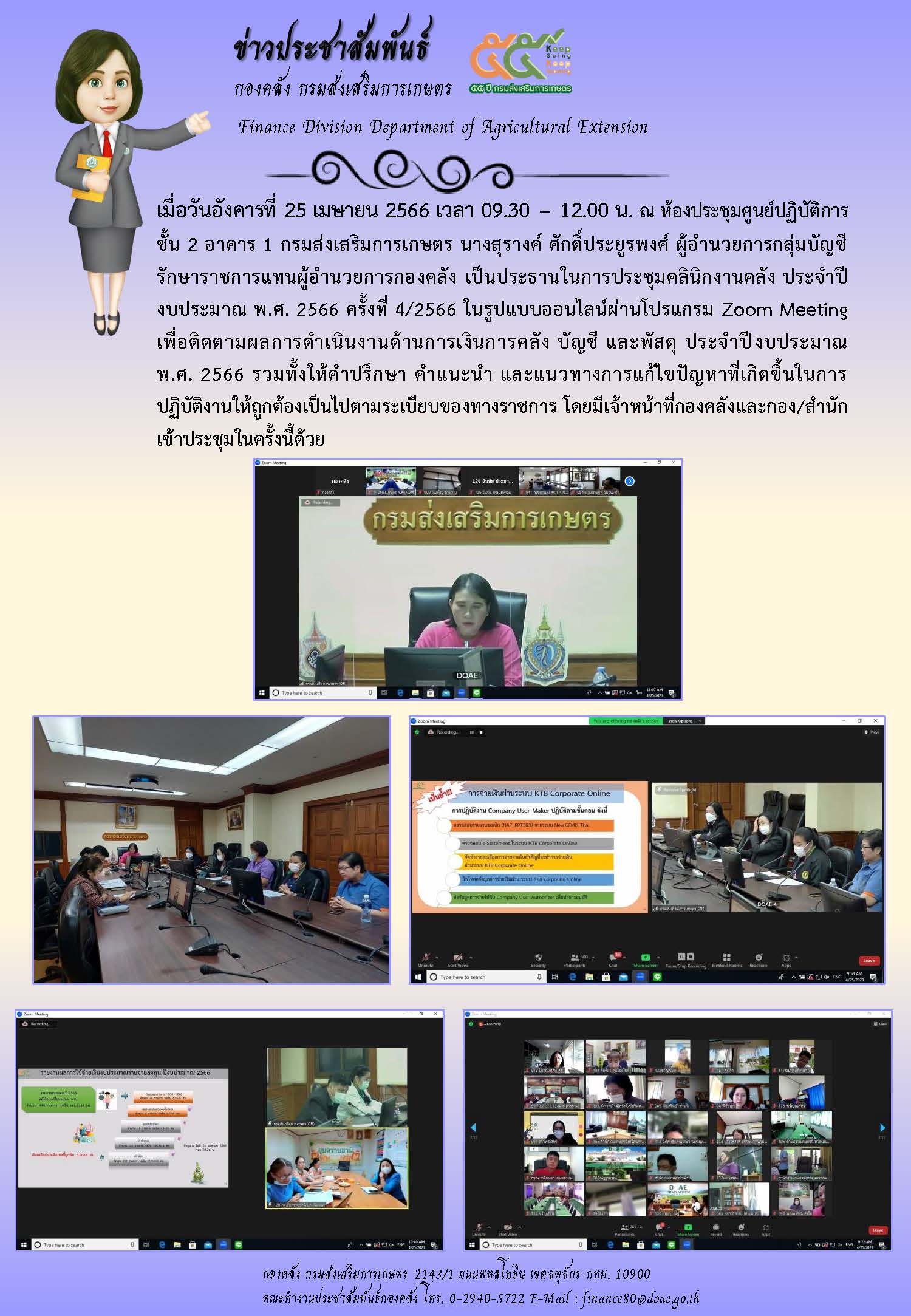 เมื่อวันอังคารที่ 25 เมษายน 2566 เวลา 09.30 – 12.00 น. ณ ห้องประชุมศูนย์ปฏิบัติการ ชั้น 2 อาคาร 1 กรมส่งเสริมการเกษตร นางสุรางค์ ศักดิ์ประยูรพงศ์ ผู้อำนวยการกลุ่มบัญชี รักษาราชการแทนผู้อำนวยการกองคลัง เป็นประธานในการประชุมคลินิกงานคลัง ประจำปีงบประมาณ พ.ศ. 2566 ครั้งที่ 4/2566 ในรูปแบบออนไลน์ผ่านโปรแกรม Zoom Meeting เพื่อติดตามผลการดำเนินงานด้านการเงินการคลัง บัญชี และพัสดุ ประจำปีงบประมาณ พ.ศ. 2566 รวมทั้งให้คำปรึกษา คำแนะนำ และแนวทางการแก้ไขปัญหาที่เกิดขึ้นในการปฏิบัติงานให้ถูกต้องเป็นไปตามระเบียบของทางราชการ โดยมีเจ้าหน้าที่กองคลังและกอง/สำนัก เข้าประชุมในครั้งนี้ด้วย